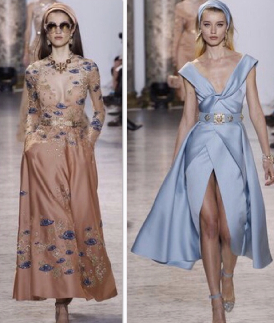 Elegance from the past Elie saab inspired his collection spring/ summer 2017 from the golden period. It appeared in bouffant dresses, long, medium length, oriental inscriptions , geometric lines, palm trees and star shapes.The blue eye which symbolize Domiat ( a historical area in Egypt ) in embroidery and engraving of arabic calligraphy on smooth and translucent fabrics as tulle, lace, in gradients of colors, grey, white, blue, pink, gold .